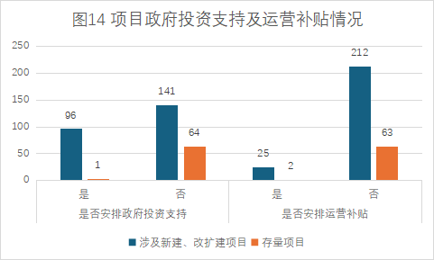 政府投資支持及運(yùn)營補(bǔ)貼:新建及改擴(kuò)建項(xiàng)目中,安排政府投資支持項(xiàng)目數(shù)量為96個,占比40.51%;安排運(yùn)營補(bǔ)貼的項(xiàng)目數(shù)量為25個,占比10.55%。存量項(xiàng)目中,安排政府投資支持項(xiàng)目數(shù)量為1個,占比1.54%;安排運(yùn)營補(bǔ)貼的項(xiàng)目數(shù)量為2個,占比3.08%(詳見圖14)。