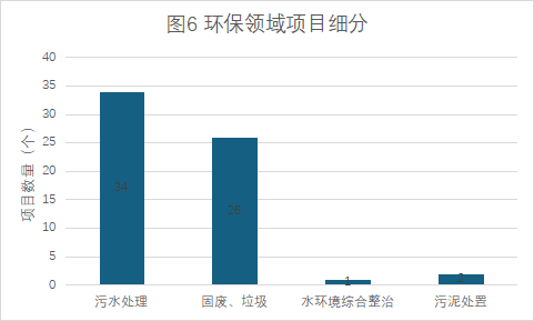 環(huán)保領(lǐng)域:已入庫項(xiàng)目中,環(huán)保領(lǐng)域項(xiàng)目以污水處理及固廢、垃圾收運(yùn)處置為主,其他水環(huán)境綜合整治及污泥處置項(xiàng)目較少(詳見圖6)。