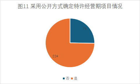 特許經(jīng)營期的確定:新機(jī)制實(shí)施后,大部分項(xiàng)目都采用公開方式確定特許經(jīng)營期,已入庫302個項(xiàng)目中,只有78個項(xiàng)目未明確采用公開方式確定特許經(jīng)營期(詳見圖11)。