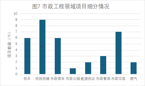 市政工程領(lǐng)域:主要項(xiàng)目類型為供熱供暖、市政垃圾、供水、市政停車,此外還有少部分市政公園、能源供應(yīng)、管道、燃?xì)獾龋ㄔ斠妶D7)。