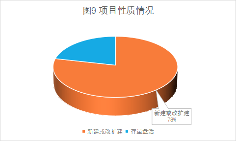 項(xiàng)目性質(zhì):已入庫的302個項(xiàng)目中,涉及新建或改擴(kuò)建的項(xiàng)目237個(占比78%),純存量資產(chǎn)盤活項(xiàng)目65個(占比22%),詳見圖9。